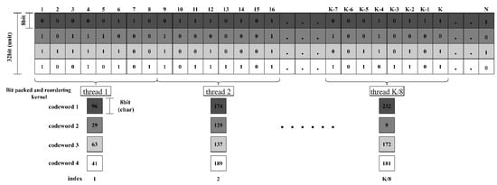 This kernel is mainly responsible for the decoded data ordering and packing works. Corresponding to the ordering operation, the reordering operation is performed in this kernel. To reduce the transmission latency, we implement the bit packed operation in this kernel to pack the decoded data. The process of the bit packed and reordering kernel is shown in Figure 7. Each thread in this kernel first performs the ordering operation, unpacking 32-bit data to four 8-bit data. Then, the thread grabs eight adjacent 8-bit from the decoded data pack to one 8-bit data because the decoded data can be represented by one bit after the hard decision. In addition, only the information data (length is ) in the decoded data (length is ) is useful after the decoding iteration, so the length of the final data that needs to be transferred becomes . As a result, the amount of data transferred from the GPU device memory back to the CPU host memory is reduced after the bit is packed, and the transfer time becomes 1/32 of the 32-bit quantization scheme.