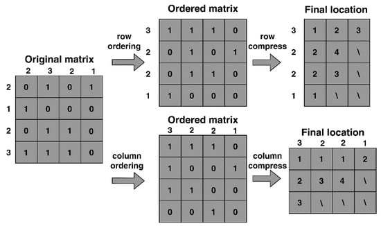 Since PCM is not changed during decoding iteration and needs to be used by most kernels, we can store in the constant memory to reduce the memory access latency. However, due to the limited size of the constant memory, we should compress before decoding. Since the ‘0’ elements in do not participate in the decoding iteration, these elements can be ignored. Based on the compressed column storage (CCS) method [39], we order and compress to the row-degree and column-degree versions for the VN update and CN update computations, respectively. For the row-degree version, we need to count the number of non-‘0’ elements (row degree) in each row, and then order the row of according to the row degree. After ordering, we only need to store the row degree and non-0 element index of each row. Similarly, for the column-degree version, we only need to store the column degree and non-0 element index of each column. The ordering operation in the compress method is to meet the requirement of CUDA for the fixed-sized data structure, thereby avoiding accessing erroneous places while decoding. It should be noted that when the matrix is too large, the data index will be beyond the range of 8-bit data, so we use the 16-bit data type to store the compressed matrix information. After compression, the row-degree version and column-degree version matrix are loaded by the host onto the constant memory of GPU, and the storage space occupied by with a code rate of 1/3 in 5G NR becomes 0.03% of the original. The details of the compression method are shown in Figure 9.
