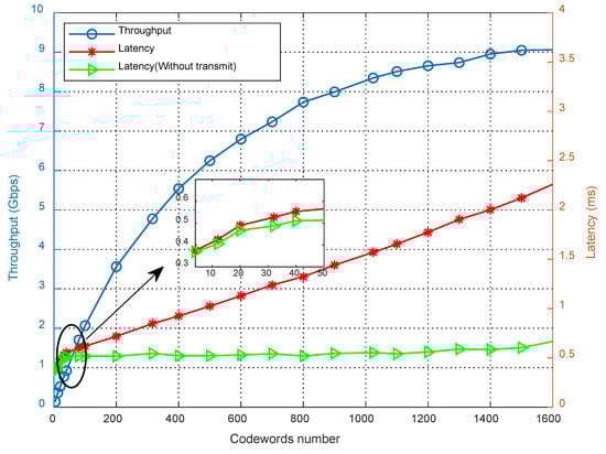 The throughput and latency curve of the proposed decoder with different numbers of codewords.