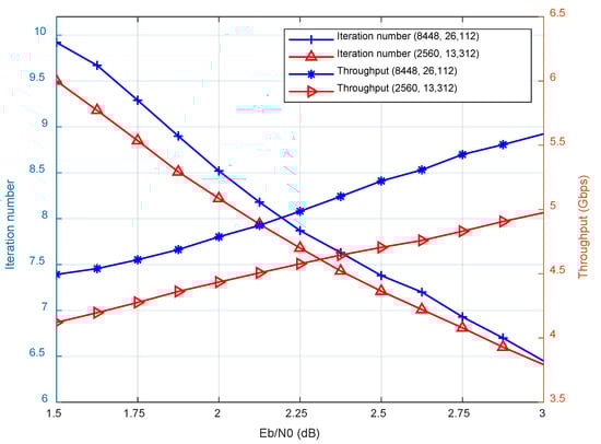 Figure 11 shows the throughput and iteration number of the decoder with the change channel quality after the ET mechanism is opened (the maximum iteration number is set as 10, and Eb/N0 from 1.5 to 3.0). The proposed decoder introduces the ET mechanism to reduce the decoding time when the channel quality is high. Figure 11 shows the performance for LDPC codes with base BG1 and BG2 in 5G NR, and the expansion factor is 384 and 256, respectively. It should be noted that the throughput result in Figure 11 is slightly lower than the result in Section 4.1 due to the need to perform additional verification operations. We observed that with the increase in Eb/N0, the iteration number decreased. When SNR values are below 2 dB, to successfully obtain the corrected decoded data, the maximum iteration number of 10 is almost all executed, which results in the very low total throughput and large iteration number. At a high Eb/N0 value, few decoding iterations are needed to be performed before the correct codeword data is obtained, so the throughput is high. It is observed that the curves in this figure only display the part average throughput and iteration since the number of iterations that are actually executed lowers as Eb/N0 increases and the throughput at high Eb/N0 values can also continue to increase.