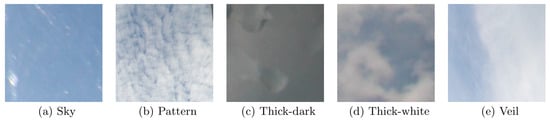 Although there have been many studies analyzing sky/cloud images captured by ground-based cameras by several research groups, publicly available standard databases are rare. Some datasets are released for cloud detection or segmentation purposes—for example, HYTA [30]. In addition, this paper also evaluates the proposed approach on the Cloud-ImVN 1.0 [31]. This dataset was created based on inspiration from the SWIMCAT dataset, with a larger number of images and more cloud/sky types. Specifically, the Cloud-ImVN 1.0 dataset has 2100 images of sky/clouds, classified into 6 categories: clear blue sky, patterned clouds, thick dark clouds, thick white clouds, thin white clouds, and cloud cover (Figure 4).