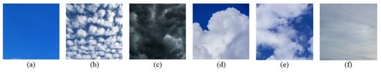 Six categories of cloud/sky images in the Cloud-ImVN 1.0 dataset: (a) clear blue sky, (b) patterned clouds, (c) thick dark clouds, (d) thick white clouds, (e) thin white clouds, (f) cloud cover.