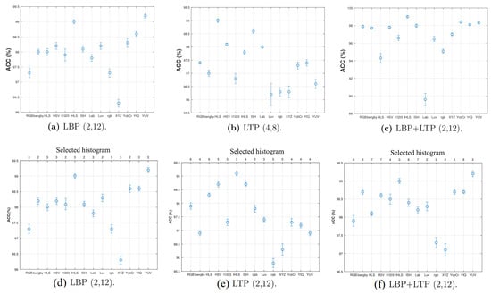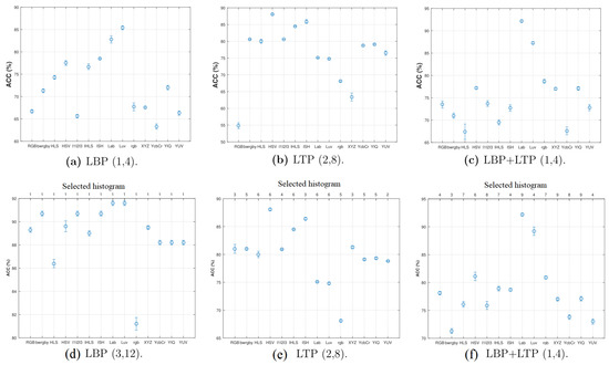 Figure 6 presents the selected results of the highest accuracy obtained from three types of features (LBP, LTP, LBP+LTP) in the two scenarios: without and with the histogram selection method.