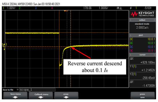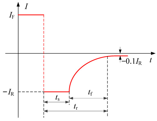 It is generally specified that after the , represents the time it takes when the current drops from to . Among them, is the reverse current flowing through the diode when the applied voltage turns from forward to reverse during the reverse recovery measurement. is called the storage time, called drop time, called reverse recovery time or shutdown time [21].