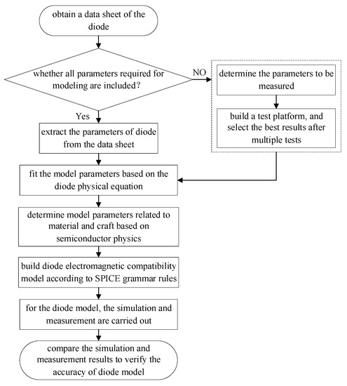 Diodes, as important nonlinear components, are widely used in various electronic systems and are important components considered in the EMC simulation. Leila et al. researched a new simplified model for predicting conducted EMI in DC/DC converters; the high-frequency disturbance estimation is based on the knowledge of circuit parasitic elements and semiconductor device parameters [4]. Kurt et al. focused on the modeling of bypass diodes in transient analysis and simulation photovoltaic installations [5].
