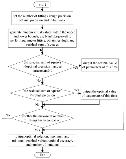 First, the derivative values of three groups of specific points are estimated from the experimental data, and then substituted into the first-order derivative expression of the fitting objective function. We observe the values of , and are 1.648 × 10−11, 16.545 and 1.636, respectively. The analytical solutions of , and are considered as the upper limit of the initial value in the nonlinear fitting stochastic optimization algorithm, and the typical values are set as the lower limit of the initial value of the fitting.