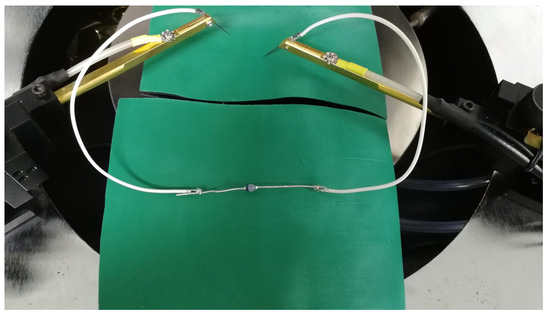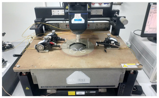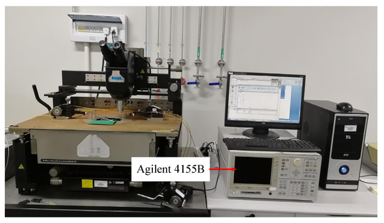 The I-V static parameter test system for diodes is shown in Figure 4, which consists of the Agilent 4155B semiconductor parameter analyzer, a semi-automatic probe test bench, and a computer with Agilent EasyExpert software installed. The Agilent 4155B semiconductor analyzer has a current-voltage resolution of 10 fA/μV and a corresponding measurement range of 100 mA/100 V. Agilent EasyExpert test software provides the Agilent 4155B with a full range of diode static parameter testing that controls test instruments and probe stations for fully automated I-V scanning tests in DC or pulse mode. The test layout of the 2CZ106C fast recovery diode is shown in Figure 5.