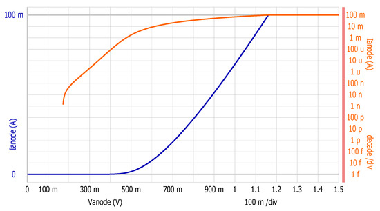 The previous equation is the famous Schokley equation in semiconductor physics, is the diode applied voltage, is the Boltzmann constant, is the electron charge, is the absolute temperature, at room temperature is the temperature voltage equivalent, and at room temperature , there is .