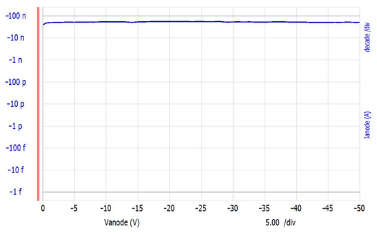 After completing the test system connection, test calibration via Agilent EasyExpert software is also required to eliminate test instrument errors and ensure the accuracy of experimental data. The forward I-V test results are shown in Figure 6, and it can be seen from Figure 6 that at about 1.15 V forward bias, the forward current of the diode 2CZ106C reaches the upper limit current of 100 mA allowed by the instrument, and its opening voltage is about 0.5 V, and the on-voltage is about 0.6~0.7 V. The test results of reverse I-V are shown in Figure 7, where it can be seen that the reverse leakage current of diode 2CZ106C is nA level within the reverse bias voltage of −50 to 0 V (that is, before reverse breakdown).