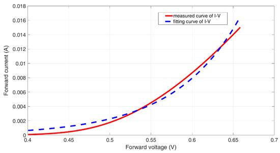Figure 8 shows the comparison between the fitted curve and the measured curve. It can be seen from Figure 8 that the fitted curve is basically consistent with the measured curve; the two curves are well matched. Therefore, the diode parameters obtained by fitting have high accuracy.