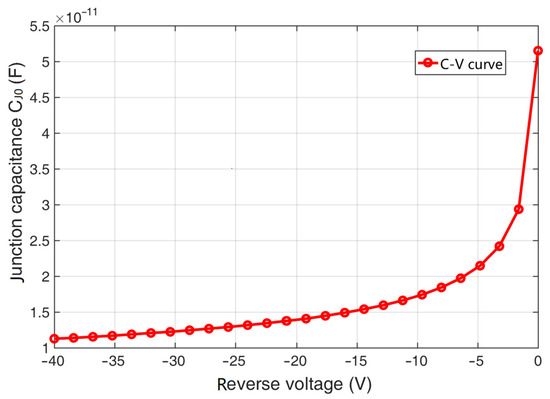 Since the order of magnitude of diode junction capacitors is generally pF level, which is a smaller capacitance, when testing the diode 2CZ106C junction capacitance, we choose a combination of measurement parameters in parallel. The test step is to open the Agilent 4294A impedance analyzer in advance to warm up for at least 20 min, then perform phase compensation, open circuit compensation, short circuit compensation and load compensation, open the test software QuickTest, set the sample information and select the bias parameter for testing. According to the actual environmental conditions, the test temperature is set to 19.6 °C, the sweep bias frequency is 1 MHz, the DC bias range is −40~0 V and the test data point is 26. Only a bias sweep of the diode 2CZ106C junction capacitance curve data can be obtained, so the test parameters are selected and not displayed . The detail of the diode’s junction capacitance parameter test is shown in Figure 10, and the test result is shown in Figure 11.