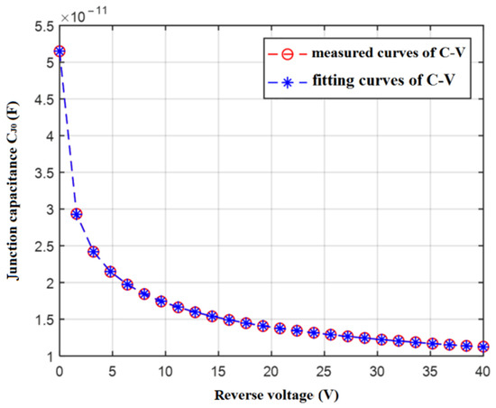 Comparison of fitting and measured curves of junction capacitance characteristics.