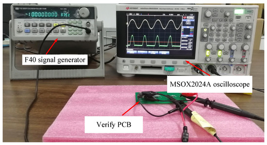 The PCB board, shown in Figure 17, is designed and fabricated. To avoid introducing errors caused by too many other components, only 100 Ω resistors are used as loads to protect the diodes, which are shown in Figure 13; the model verification platform uses a signal generator to provide different frequency excitation signals and an oscilloscope to test the time-domain waveforms.