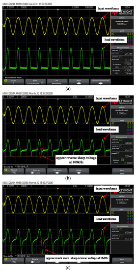 Experimental test results: (a) Input and load waveforms of 10 kHz excitation; (b) Input and load waveforms of 100 kHz excitation; (c) Input and load shape of 1 MHz excitation.