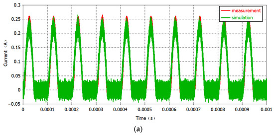 This slight error may be due to the following reasons: First, the model parameter that reflects the reverse recovery characteristics of the diode is the transition time . From Equation (1), only a few parameters are considered to calculate the reverse recovery characteristics and these cannot fully reflect the reverse recovery process at high signal frequencies; Secondly, the data of the reverse recovery characteristics are mainly derived from measurements, and then the transition time TT is calculated by theoretical formulas. This process may introduce certain experimental errors, and the assumptions made in the derivation of theoretical formulas ignore the influence of some practical factors; Finally, the transition time TT has been modified during modeling, due to the irregularity of the internal carrier motion of the diode and the complexity of the internal electric field distribution, and there may still be some modeling errors after the approximate correction.