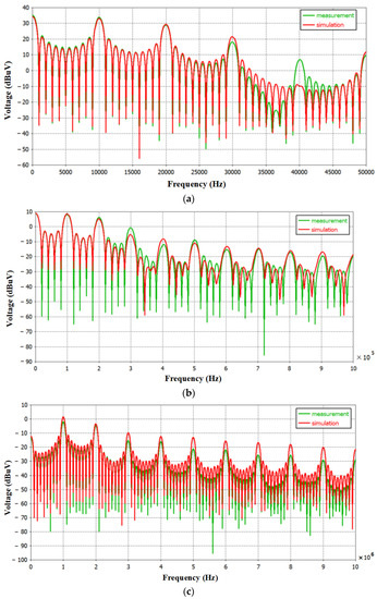 Frequency domain comparison of measured and simulated results: (a) 10 kHz; (b) 100 kHz; (c) 1 MHz.