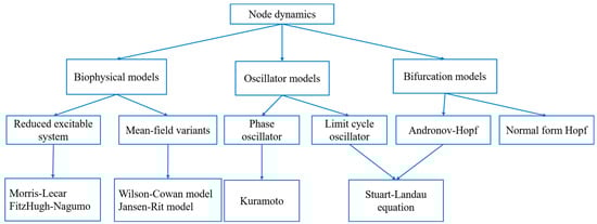 According to the level of detail and neurophysiological relevance, models of node dynamics can be divided into biophysical models, oscillator models, and bifurcation models. The mean-filed models and Kuramoto oscillators are the most commonly used models of node dynamics.