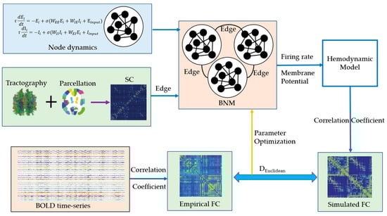 The pipeline for fitting BNMs to time-averaged FC. The node dynamics are modeled by neural mass models to output average firing rates or membrane potentials. SC is estimated by tractography combined with parcellation schema and acts as edges of brain networks. Then, the mesoscopic neuronal populations are connected by SC to simulate macroscopic spatiotemporal brain activity. The output of each node is fed into the hemodynamic model to simulate BOLD time-series, then correlation coefficients (such as Pearson’s correlation coefficient) in the whole-time interval are computed for time-series of each pair of nodes to construct time-averaged FC. The Euclidean distance is used to evaluate the similarity between empirical FC and simulated FC [,], based on which model parameters can be optimized.