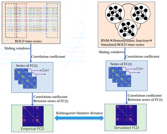 Many works have highlighted the nonstationarities that depict time-dependent FC dynamics. Analysis of FC data has moved beyond time-averaged to dynamic methods that assume the coordination of brain activity changes over time [,,]. Dynamic FC reflects time variations of correlations between pairs of brain regions and is characterized by the ongoing switching of network patterns [,]. The Kolmogorov–Smirnov distance is often used to quantify the difference between simulated dynamic FC and empirical dynamical FC [,].