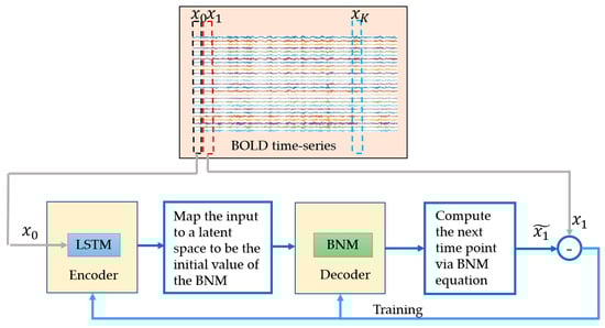 BNMs have done well in fitting the time-averaged FC, but they are variable at reproducing transient dynamic properties that occur at shorter timescales because BNMs are not synchronized with actual measurements. Then, Kashyap et al. presented a brain network autoencoder framework in which the BNM is in conjunction with a long short-term memory neural network (LSTM). As given in Figure 4, the measures are input into the LSTM to be constrained to a smaller space defined by BNM, and the next time point is reconstructed through a BNM forward equation. Then, the mismatch between the reconstructed next time point and the empirical signal is fed into the machine learning system to fit the model to an fMRI time-series [].
