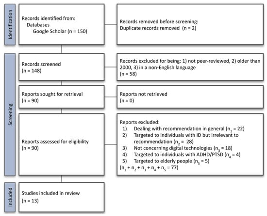 This led to a total of 13 articles that are included in our review (4 content recommendation systems for individuals with ID and 9 works regarding other resource recommendations for individuals with ID). We note that, although we put significant effort into identifying works that propose a recommendation scheme for individuals with ID, the possibility that some studies may have gone unnoticed remains open. The aforementioned process is illustrated in Figure 1. Finally, we followed a similar procedure for collecting the background information discussed in Section 2 and Section 3, i.e., general information on recommendation techniques, intellectual disability and indicative initiatives, and research projects targeting individuals with ID.
