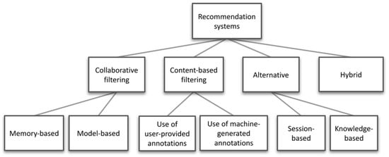 Content recommendation techniques can be distinguished based on their knowledge source [6], with a common categorization [7,8] being based on the two main approaches of building a recommender system [9]: (1) collaborative filtering and (2) content-based filtering (see Figure 2).