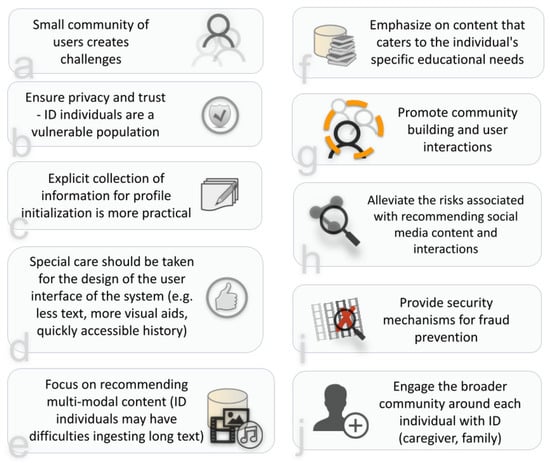 Systems that deal with transportation and traveling for tourism have been designed with the general population in mind. Individuals with ID may face difficulties using such systems. In [135], the utility of a system called Smart Travel Concierge System (STCS) is examined based on the assumption that people with ID often rely on friends and family to get where they want and need to go. This system can contribute to pre-trip assessment and planning activities to support people with ID to transit more independently, even using fixed-route public transportation. It is a hybrid recommender, borrowing features from knowledge-based systems (i.e., having stored information about the products) and collaborative filtering (i.e., constructing and comparing user profiles). An interesting feature of the system is a “cognitively accessible” approach in designing the user interface, which results in using multimedia for the questions asked during the explicit information gathering stage. In [136], Vulcanus 2.0 is proposed, which is a recommendation system for accessibility, where “resources” are the items that the system recommends to the user and a “trail” represents the path that each user follows throughout the day, maintaining a chronological history of the usage of such resources. The resources may be generic, providing conveniences to all disabilities (e.g., a parking space), or specific, supporting only some types of disability (e.g., an access ramp). It collects the needed information about users employing mostly implicit information collection. Specifically, it takes advantage of information extracted from the user’s history, thus achieving its goal of transparent operation. However, such a design approach can raise privacy issues in a real-life setting. It follows a hybrid approach, using information from the other users to make better recommendations (a collaborative filtering notion), while also utilizing information about the items (a content-based filtering feature). SOLVE-D [137] is a context-sensitive service recommendation framework for disabled people in smart home environments. For example, when a certain disabled user physically approaches a specific home appliance, such as a laundry machine, the system recommends a standard process to operate it. The aforementioned paper does not delve into details regarding their “User Identification Module”, but a figure depicts this module built in a home server with no access to the Web, a feature which makes privacy and security inherent in the system design. The end result is a complete system to support users with ID in making good use of a smart home setting.