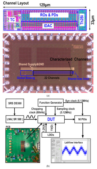A prototype chip was implemented and fabricated using a 55 nm CMOS technology. The chip micrograph and channel layout details are shown in Figure 3a. Each channel occupies an area of 129 µm × 33 µm. In order to evaluate the influence of the neighboring channels (i.e., VCO oscillation interferences) on the proposed CTDSM readout performance, a total of 22 channels sharing the same biasing voltages and supplies were implemented on the chip. All the channels share the same biasing, supply voltages, and ground lines, which are distributed from left to right to replicate the layout constraints in ultra-dense neural probes [8,9]. In this proof-of-concept prototype, the outputs of only 3 out of the 22 channels are accessible for characterizations. These three channels include two that are right next to the global biasing block (these are the best-case channels) and one that is the farthest from the global biasing block (this is the worst-case channel). In this work, we used the setup shown in Figure 3b to characterize the three channels. The worst-case channel will pick up the highest noise coupling and interferences from the other channels, and the impacts of these coupling effects and interferences can be quantitatively evaluated by comparing the results in two cases: (i) when all other channels are enabled and (ii) when all other channels are disabled. To test the chip, we developed a custom-printed circuit board using Altium and used a National Instrument module to acquire and analyze the chip output data, while the required decimation filter was implemented in software.