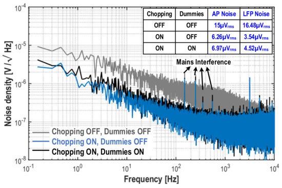 The measured noise spectrum and the integrated input-referred noise in the LFP (0.5–1000 Hz) and AP (0.3–10 kHz) bands are shown in Figure 4. The effectiveness of the chopper-stabilization technique is demostrated in this measurement. When the choppers in the TC stage were disabled, the noise is 2.4 times higher in the AP band and 4.65 times higher in the LFP band. Note that a residual low-frequency flicker noise is visible in the noise spectrum, which is because the transistors that form the PMOS current mirror in the TC stage (MP5-6 and MP9-10) are not chopped. This is a design choice made to avoid the aliasing of high-frequency-shaped quantization noise in the IDAC feedback, as elaborated in Ref. [18]. From these results, we can also conclude that the AP and LFP noise only increases by 11.3% and 27.7%, respectively, in the worst-case channel when all 22 channels were enabled. This increased noise is still below what is acceptable for the application [1,2,8,9], demonstrating the suitability of the proposed VCO architecture for multi-channel operation.