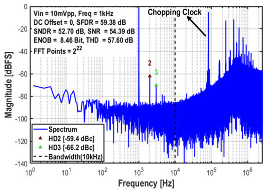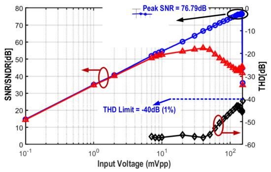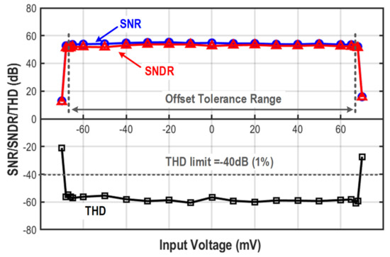 The power spectral density (PSD) of one channel was measured with a 10 mVpp, 1 kHz sinosoidal input at 0 V input DC offset (Figure 5). The achieved signal-to-noise-and-distortion ratio (SNDR) is 52.7 dB, and the signal-to-noise ratio (SNR) is 54.39 dB. The SNDR and SNR were also measured with different input amplitudes (Figure 6), resulting in a peak SNR of 76.8 dB and an effective dynamic range (DR) of 77.6 dB without any SNR degradation up to 149 mVpp. Even though the SNDR degrades for amplitudes beyond 10 mVpp, the THD remains <1% (acceptable limit in neural-recording applications) for the whole measured amplitude range (150 mVpp). Figure 7 shows the measured DC offset tolerance, indicating that the THD remains well below 1% and the SNDR is close to SNR for a wide DC offset ranging from −68 mV to +68 mV.