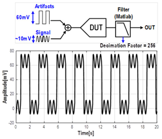 Finally, the capability to tolerate movement/stimulation artifacts is demonstrated in Figure 8. In this measurement, a large square signal (60 mVpp amplitude) was superimposed to a small sinewave to emulate the effect of a large stimulation artifact. Such artifacts can commonly happen in bidirectional neural interfaces with concurrent neural recording and stimulation. As shown in the figure, thanks to the wide DR of the design, both the large square artifact signal and the small sinusoidal signal can be recorded without distortion. The small sinusoidal signal information is not lost and can then be recovered in software without degradation. This indicates that when the chip is used in real-life neuromodulation applications, it will be able to record neural signals even in the presence of large stimulation artifacts.