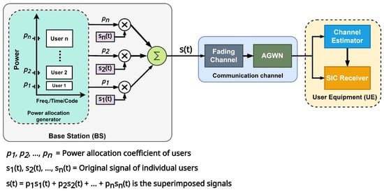 The design of 5G is to fundamentally fulfil the emerging requirements of wireless communication, such as high spectral and energy efficiency, low latency, massive device connectivity, high data rate and ultrahigh reliability [1,2,3]. Therefore, this requires a multiple access technology that meets the network capacity within the limited radio spectrum [4,5,6]. NOMA technique is considered for 5G networks to improve system performance, high reliability, increased system capacity and coverage area [7,8,9]. NOMA, unlike orthogonal multiple access (OMA), uses the same time, code and or radio frequency resources to provide services to multiple users. This is done by introducing controlled interference through non-orthogonal resource allocation [10]. Most importantly, it supports large numbers of connections and high-congestion transmission [11]. The basic operation of NOMA is to superimpose multiple signals at the transmitter in the power domain. As shown in Figure 1, at the Base Station (BS), data from various users are superimposed on top of one another over the same time/frequency/code resource block. The BS uses a power allocation generator to assign different power levels to each user within resource block. The superimposed signal, , is transmitted through a fading channel with additive white Gaussian noise (AGWN) to the receiving user equipment (UE). The Gaussian channel’s output is the sum of the input signal and an independent identically distributed noise signal from a Gaussian distribution of variance N, that may be produced by the receiver electronics [12]. In addition, at the UE, NOMA employs interference cancellation (SIC) method to improve network performance, to minimize interference and separate multiplexed users [13]. In NOMA, the weak user treats a strong user’s signals as noise and directly decodes its signal [14]. The strong user on the other hand uses SIC to detect and decode their signals [7]. Additionally, weak users receive more power than strong users due to interference and poorer channel gains [15]. This is intended to maximize weak user transmission rate, experience and fairness [14].