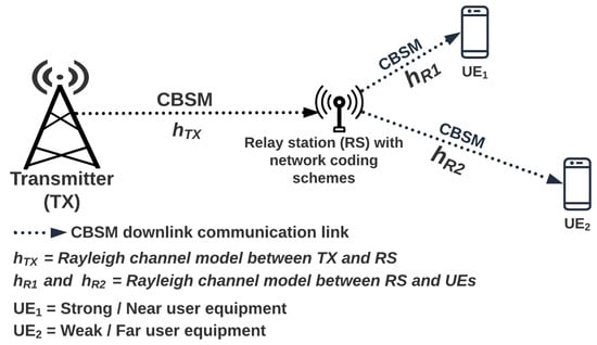 where is a non-fading variable path gain, is the reference distance’s path-loss exponent, is the reference distance, is the normalized relay distance from the source, and k is the path-loss exponent of the TX−RS channel. The effective distance is the actual distance of TX−RS in meters, where the cell radius is . To reduce the impact of inter-user interference on each user, SIC at the destination’s receiver [108]. The effective users’ channel gains determine SIC decoding order in ascending order, that is . The signal-to-interference noise ratio () for the strong user (UE1) to decode by applying SIC processing is given in [109] as