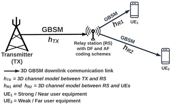 Here, we consider a two-hop downlink communication between a TX and two UEs through a dedicated RS and apply the 3D GBSM channel to the TX−RS and RS−UEs communication links.