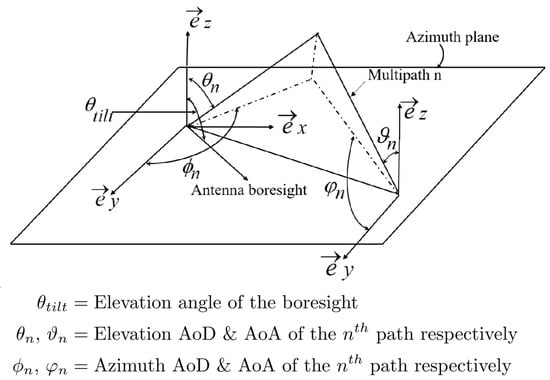 We consider the 3GPP’s standard, based on the GBSM method [90,93,99], to provide a new 3D channel model in which the TX antenna is modeled as URA or CA. The main parameters of importance in the 3D channel model are; delay spread (DS), angle of arrival (AoA), azimuth of departure (AoD), elevation angle of arrival (EoA) and departure (EoD) [17,100,101]. In addition, the 3GPP standard under consideration presents the elevation angle of the antenna boresight into the channel and allows for dynamic adaption of the antenna’s downtilt angles . This provides various advantages for 3D beamforming leading to significant improvement in system performance [95]. The 3D channel model is illustrated in Figure 4.