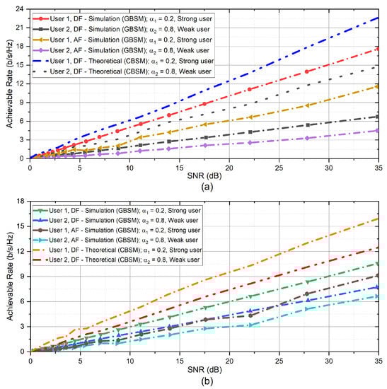 The maximum rate in the channel where the BER tends to zero [110] describes the achievable rate of the system. When the CSI is unknown at the transmitter, if separate equi-powered transmissions are assumed, the achievable rates of the UEs can be determined using SINR values. From (19)–(21), the achievable rates of the UEs using AF coding scheme are respectively given by