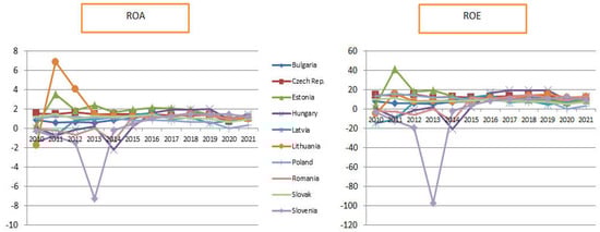 In most of the countries included in the analysis, ROA recorded positive values that fell within the range of 1–2%, with a few exceptions that are important to mention because they will represent future outliers in the econometric analysis. First of all, Lithuania shocked by jumping from the value of −1.72% recorded in 2010 to no less than 6.89% in 2011, being the country with the highest ROA among those analyzed in the period 2010–2021. According to Novickytė and Droždz, the profitability of Lithuanian banks is increasing due to significantly decreased interest expenses and increased efficiency [61]. Another exceptional situation was found in Slovenia, a country where the ROA suffered a significant and sudden drop from −1.48% in 2012 to −7.29% in 2013. This decrease is explained by the fact that the quality of loan portfolios had continuously deteriorated, but also by the need for large banks with state capital to receive additional capital [62]. Still other exceptions, but of a smaller scale, were Estonia with a positive value of ROA in 2011 of 3.54% and Hungary with a negative value of ROA of −2.24%.