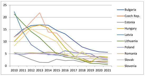 In order to capture an overview of the financial performance of the banking systems in the 10 CEECs, we used three variables—ROA, ROE and NPL—as reference indicators. The evolution of these indicators in the period 2010–2021 is presented in Figure 1 and Figure 2.