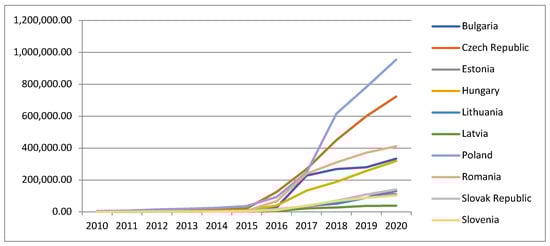 In Figure 3, we outline the evolution of server security from the point of view of the number of registered certificates. We note that although until 2015 the number of certificates was insignificant, since 2016 it has registered substantial increases, with the leading country in this regard being Poland, followed by the Czech Republic, Romania, Bulgaria and Hungary. However, there were also outstanding countries from this point of view, one of them being Latvia, where the number of registered certificates practically stagnated during the entire time period under analysis.
