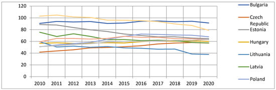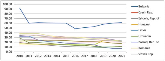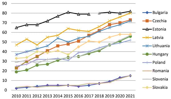 However, the security of bank servers does not necessarily influence the intensity of internet banking use. We observe in Figure 4 that, although in absolutely all CEECs the percentage of use of internet banking increased significantly from 2010 to 2021, the highest percentage of internet banking users were registered in Estonia, followed by Latvia, the Czech Republic and Lithuania. In contrast, in countries such as Romania and Bulgaria, less than 20% of internet users used the internet to access banking services, and that was due to the low level of digital skills of their populations.