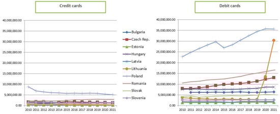 The two graphs above (Figure 5) clearly show the dominance of debit cards in the CEECs, a fact that can be partially explained by the position among banks in the analyzed countries that any current account should be accompanied by a card. Another explanation would be that, from a risk perspective, issuing a debit card is less risky for financial institutions compared to issuing a credit card, but also that these cards are preferred for online purchases and contactless payments.