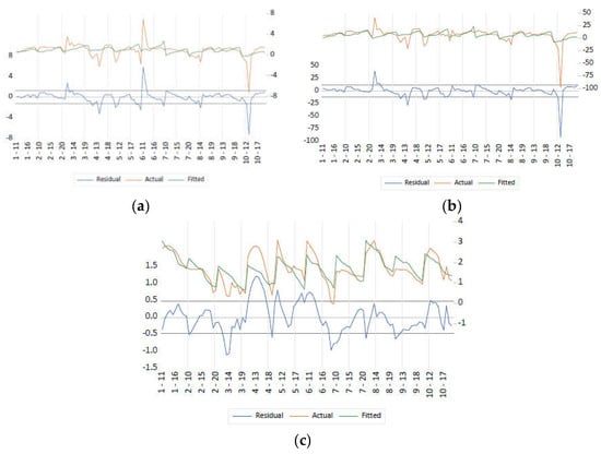 As we specified in the methodology, before deciding on the optimal type of regression for our analysis, we proceeded to identify outliers using the GETS algorithms. Analyzing Figure 8, we noticed that two outliers were identified in the case of Model 1 and Model 2, and more outliers in the case of the third model. So, we needed a parameter estimation method that was robust, where the value of the estimation would not be affected much by small changes in the data.