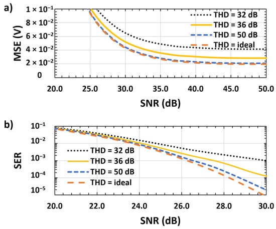 Over the last decade, data traffic has increased due to the increasing demand for streaming services, video calling, etc., implying the necessity for high-speed transceivers for either backplane or optic fiber communications in data centers. Pulse Amplitude Modulation with four levels (PAM-4) [1,2,3] is the main modulation used in wire-line transceivers, in which there are four symbols, each one representing two bits. To further improve the data rate, we can either boost the symbol rate, with the heavy constraint imposed by the channel bandwidth, or increase the order of the modulation. Some solutions can be the PAM-8 [4,5,6] or another modulation using more than four symbols [7]. In particular, while sending the same number of symbols per second, the PAM-8 improves the bit rate of the receiver by 1.5 times. However, the smaller eye aperture of PAM-8 compared to PAM-4 or Non-Return-to-Zero (NRZ) makes this modulation format very sensitive to noise, distortions, and residual inter-symbol interference (ISI). These effects increase the bit error rate of the system. The ISI and the noise can be reduced with higher current consumption (less noisy analog components and a feed forward equalizer with a higher number of taps). On the other hand, the distortions are not easy to minimize. With the reduction in the supply voltage in advanced technology nodes, the circuits increment their compressing behavior on the signal (lower total harmonic distortion (THD)) for the same dynamic range, needed to maintain a valid signal-to-noise Ratio (SNR). In Figure 1, (a) the symbol error rate (SER) and (b) the mean square error (MSE) are plotted to the varying SNR for various analog front-end (AFE) THD obtained through a MATLAB model of a PAM-8 receiver, as in [8]. The THD represents the static nonlinearities modeled with a Taylor approximation of the components’ input–output characteristics. While this model has some limitations, it shows how linearity affects the system performance in some scenarios. The plots show an improvement in the MSE and SER for higher THD values and performance approaching the ideal case for 50 dB, meaning this value should be a target for the analog circuit design.