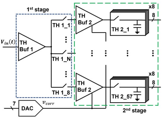 Block diagram of a 64 TI-TH circuit with in blue the first stage sampler and in green the second state, using a DAC for the second-stage buffer bias voltage control [8].
