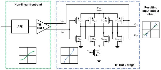 with being the small-signal DC gain, the differential small signal output, and the input one. By tuning , the input–output characteristic of the buffer can compensate not just for the buffer distortion but also for the static nonlinearities of the previous stages and AFE as well. This is represented in Figure 3, where the input–output characteristic of the AFE plus the first-stage sampler is schematized with the typical compressing behavior, and where the second-stage buffer with behavior that compensates for this compression is introduced. Unfortunately, the optimal for different PVT conditions may have considerable variations, thus a calibration that tracks the nonlinearities of the circuit becomes mandatory.