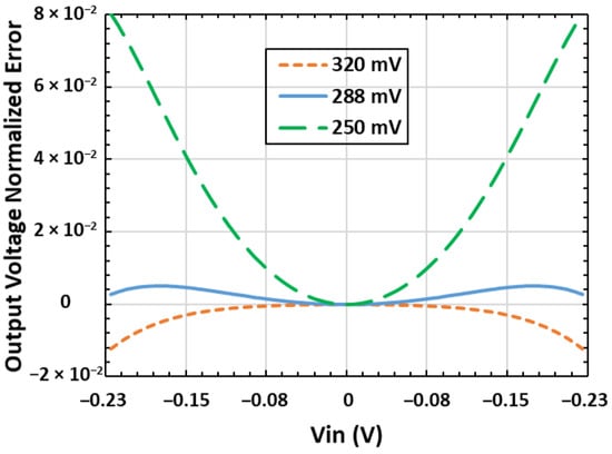 An easy way to understand how the distortion of the buffer varies for various values of is to plot, as shown in Figure 4, the relative error () between the small signal gain for high-DC differential input and the one for zero-DC differential input in different bias conditions: