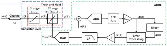 To maximize the system performance, the THD, especially of critical blocks such as the track and hold (TH) of time-interleaved (TI) receivers, needs to be optimized through calibration as a consequence of the low circuit linearity across PVT in scaled technology nodes. This solution is normally adopted in the reduction in distortions derived from the interleaved channels mismatches [9,10]. In the literature, the calibration of static distortion is rare [11,12], and no co-simulation nor indepth modeling of AFE components is introduced in the system simulation. The scope of this paper is to find a TI-TH circuit capable of achieving through calibration a receiver THD of the order of 50 dB across different PVT conditions to maximize the performance of a PAM-8 receiver (RX). Here, we show the TI sampler presented in [8] using an improved and simpler calibration loop compared to the cited one, where the complexity scales with the number of nonnegligible residual ISI pre- and post-cursors, and a gain error can introduce a component that does not let the system set to the desired value. The proposed loop uses an algorithm that eliminates the errors given by the gain and residual ISI while having a fixed complexity. Furthermore, this improved calibration was implemented in cadence virtuoso with a Verilog-A model, and its performance was verified via co-simulation with the analog circuit, while in [8] MATLAB, modeling of the analog was used.