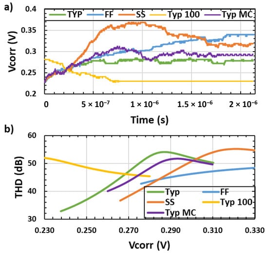 (a) Settling of the overtime during the calibration of the system and (b) the THD of the TH circuit across different values of for three different PVT conditions, one MC point, and one after a temperature step (the plot stops at = 0.33 V due to the linearity saturation (FF) for higher values).