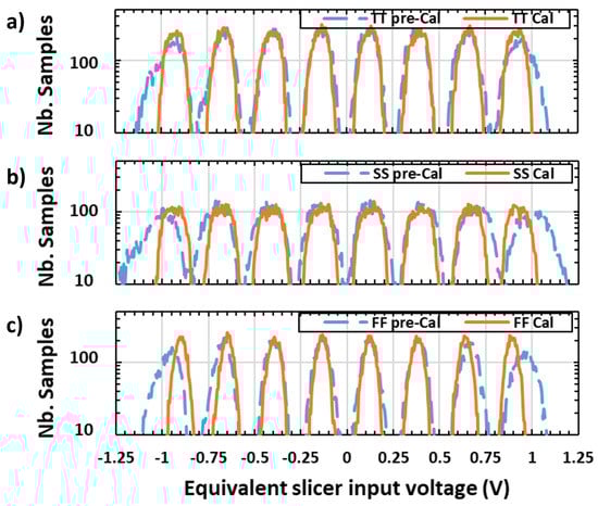 Histograms of the reconstructed signals at the slicer input before and after the linearity calibration for (a) Typical, (b) SS, and (c) FF corner.