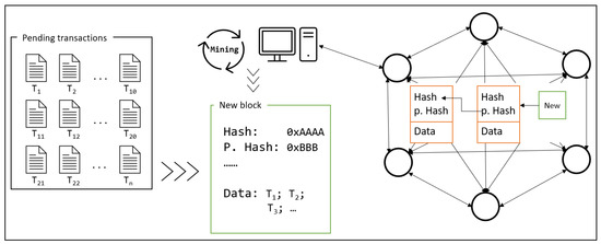 Traditionally, the main data units are cryptocurrency transactions [36,37,38,39]. As transactions are massively created and the blockchain relies on public consensus over the network, processing each transaction individually is challenging. Instead, the blockchain groups several transactions in the blocks and creates a linked chain of blocks. The blocks in the chain are ordered according to the creation time, and the latest block is written last. For security, blockchain relies on a P2P network [40] of nodes, as presented in the figure. All the nodes share the same blockchain copy. Maintaining the security and reliability of heterogeneous and dynamic nodes is a complicated process that creates delays between the creation of new blocks. As transactions are created in an unexpected manner, those created between two blocks are written in the data structure referred to as pending transactions. Depending on system requirements, blockchain architectures employ different types of mechanisms to create blocks. The most famous blockchains, such as Bitcoin and Ethereum, rely on a process termed as mining. Regarding creating blocks, when the interval arrives, the nodes read transactions from the pending transactions list and try solving the heavy mathematical puzzle to calculate the block hash. The puzzle is designed to force nodes to calculate the fixed order of the transaction and a unique hash for the block. In Bitcoin, the nodes may take about 10 min to solve the puzzle. The node that finishes solving the puzzle shares the results with the whole network and waits for confirmations. When other nodes receive a broadcast message, they check and verify the results and confirm whether the solution is true. After receiving confirmations from the majority number of nodes, the owner node further obtains the right to add a new block to the chain. When a new block is added, the new version of the chain is rebroadcasted to the network. For integrity, nodes follow the longest-chain rule [4], wherein the chain is accepted only if it is longer than the previous versions. If two or more nodes broadcast the new block simultaneously, the one with the longer chain wins the consensus and is verified by the network. Regarding the hard work and contributions to the blockchain, the owner node attains incentives in the form of cryptocurrency (Bitcoin). Moreover, all transaction fees from the new block are distributed to the network nodes as incentives for confirmation. As blockchain consensus is based on heavy computations and verifications, the entire process is also referred to as proof of work (PoW). Any arbitrary computer or server is allowed to join the public blockchain network, as long as it follows the PoW consensus. If malicious nodes try altering the consensus, rules, and transaction behavior, the updates are easily rejected by the network.